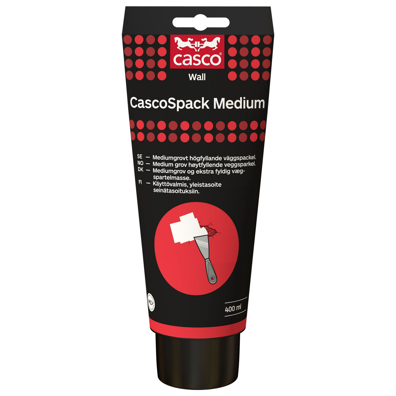 En færdigblandet vægspartelmasse med medium struktur, der kan påføres i lagtykkelse op til 4 mm. CascoSpack Medium kan anvendes til bredspartling, mindre reparationer, pladesamlinger og sparteltape. Produktet har god vedhæftning til puds, beton, spånplader og gipsplader, og er let at slibe efter optørring. CascoSpack Medium er egnet til spartling af vægge der skal males eller tapetseres. Kun til indvendigt brug (ikke vådrum).
